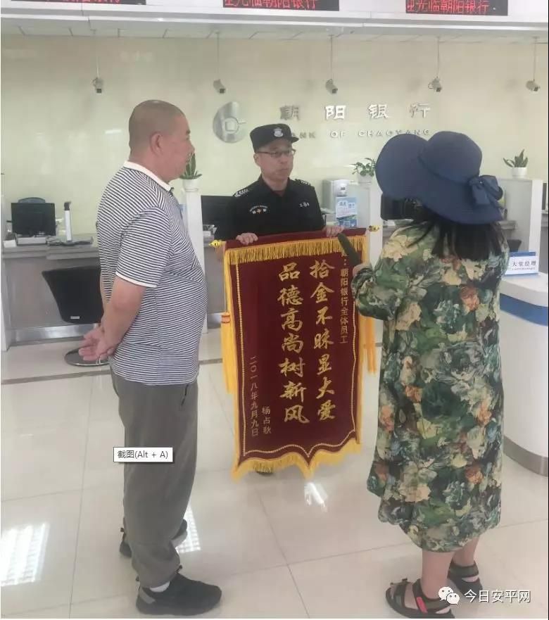 “汇通支行的员工不仅服务态度好,办事效率高,而且拾金不昧,品德高尚,要不是你们的工作人员,我昨天的 2500 元钱就丢了,实在太感谢你们了,今天,我给咱朝阳银行的员工们送锦旗来了……”,杨大爷进门拉着我行保安王福洲的手激动的说。