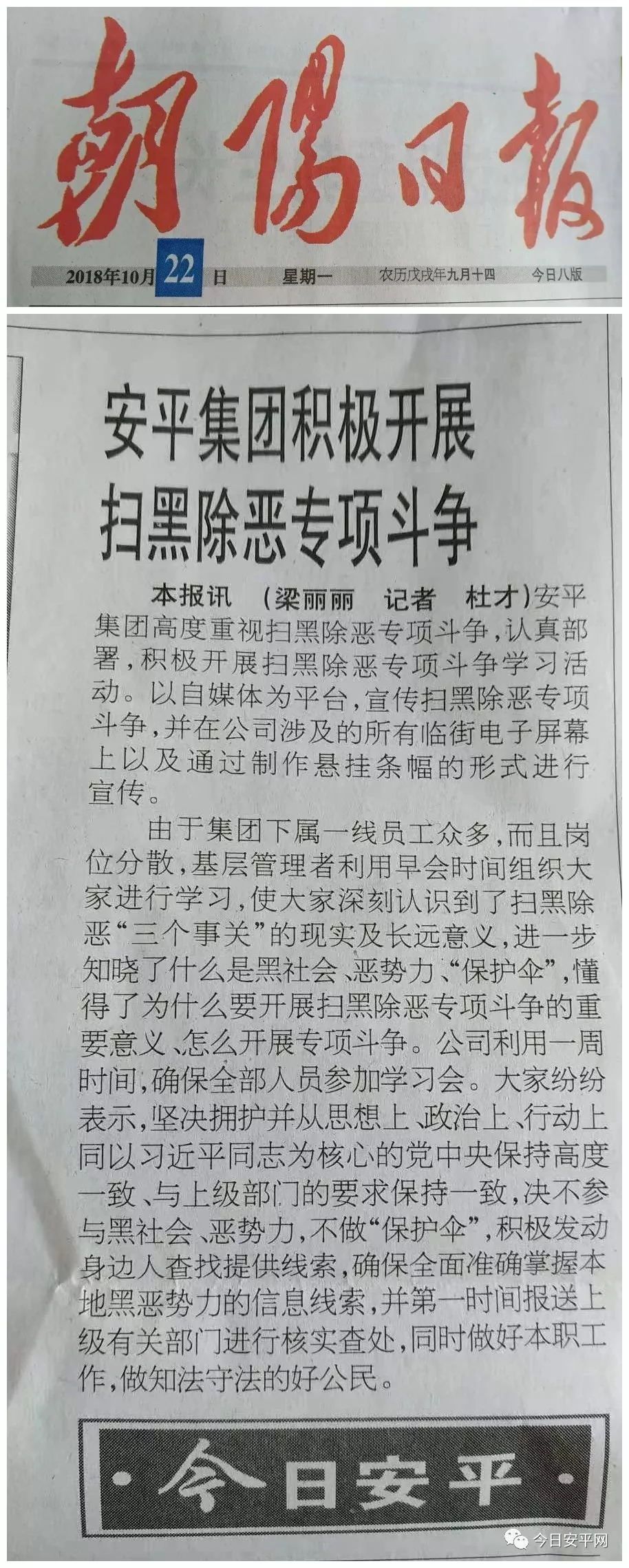 安平集团高度重视扫黑除恶专项斗争,认真部署积极开展扫黑除恶专项斗争学习话动。以自媒体为平台,宣传扫黑除恶专项斗争并在公司涉及的所有临街电子屏幕上以及通过制作悬挂条幅的形式进行宣传。