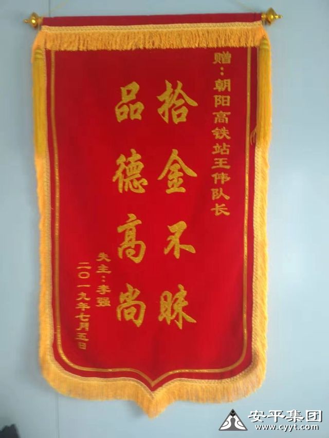 2019年6月10日,王伟执勤期间在送客区拾到钱夹一个,内有身份证和银行卡共计12张及现金755元,通过铁路公安处联系到失主李先生,及时将失物交还给他。2019年7月5日,李先生将一面写有“拾金不昧,品德高尚”的锦旗专程送到高铁站,感谢王伟及全体保安员。