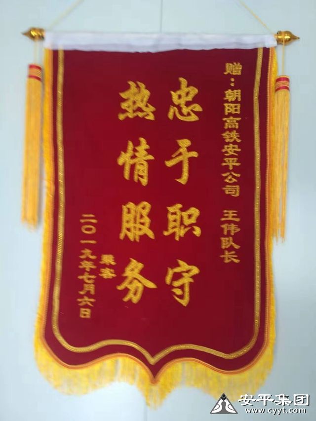 2019年7月6日,王伟在执勤中发现一下车乘客步履蹒跚行动不便,随即带领员工到站内借用残疾车一路搀扶护送至待客区乘车处将旅客扶上车,家属赶来时正好目睹了这感人一幕。感动之余,对王伟这一做法给予了高度评价,事后又专程到高铁站敬献锦旗一面,感谢安平集团保安员耐心、周到、热情的服务。