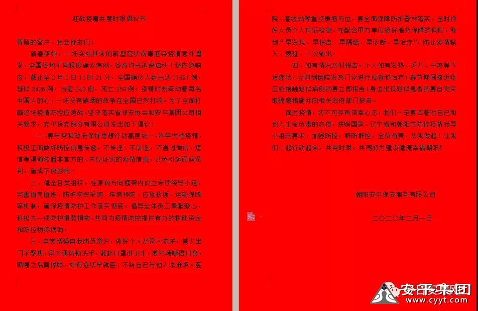 为最大范围阻击疫情,充分发挥群众力量,同时有效开展疫情预防工作,安平保安公司向所有客户、业主发出倡议书,倡议大家要本着对自己和他人生命负责的态度,按照国家、辽宁省和朝阳市防控疫情领导小组的要求,加强防控,群防群控,全员有责,从我做起!让我们一起行动起来,共克时艰,共同努力建设健康幸福朝阳!